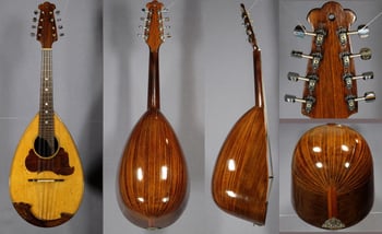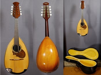 Konzertmandola "Campanella D´Oro",in restauriertem Zustand, 41,5cm Mensur, neue gekapselte Mechaniken, Griffbrett überholt, Lack aufgearbeitet, ein offen und warm klingendes Instrument mit Spuren intensiver Nutzung aber voll einsatztauglich, im neuen Bergner-Maßetui, 2380€